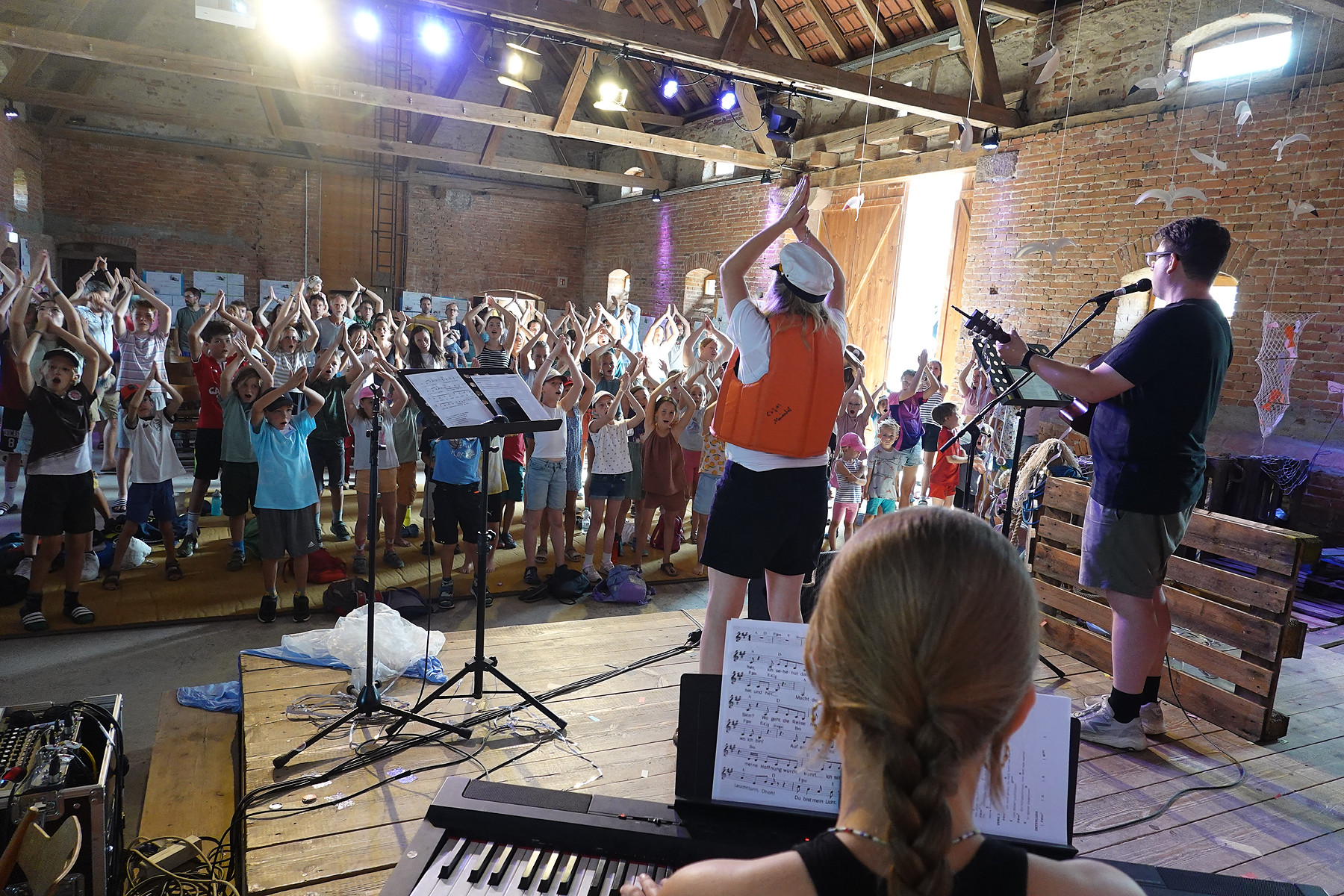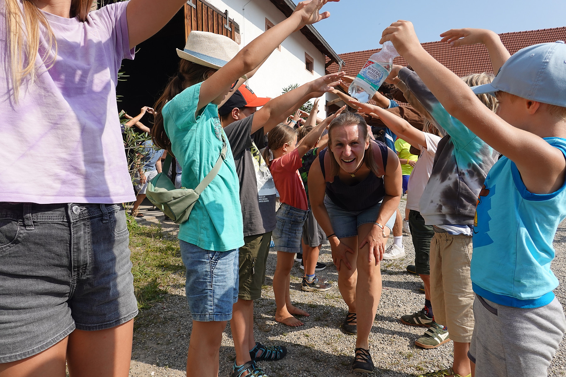 Das Vormittagsprogramm am nächsten Tag startete nach dem Frühstück in der Veranstaltungsscheune mit dem Kinderlobpreis. Großartig, wie die Kinder die Scheune rockten und auch die Erwachsenen mit in den Lobgesang für Gott hineinzogen. Im Anschluss war dieses Jahr etwas anders als sonst. Da dieses Jahr über 60 Schulkinder dabei waren, passten sie nicht mehr in den kleinen Saustall und blieben deshalb in der großen Scheune. Und statt dass die Erwachsenen die Kinder verabschiedeten, war es andersherum: Die Schulkinder verabschiedeten mit einem Segenstunnel die Erwachsenen.