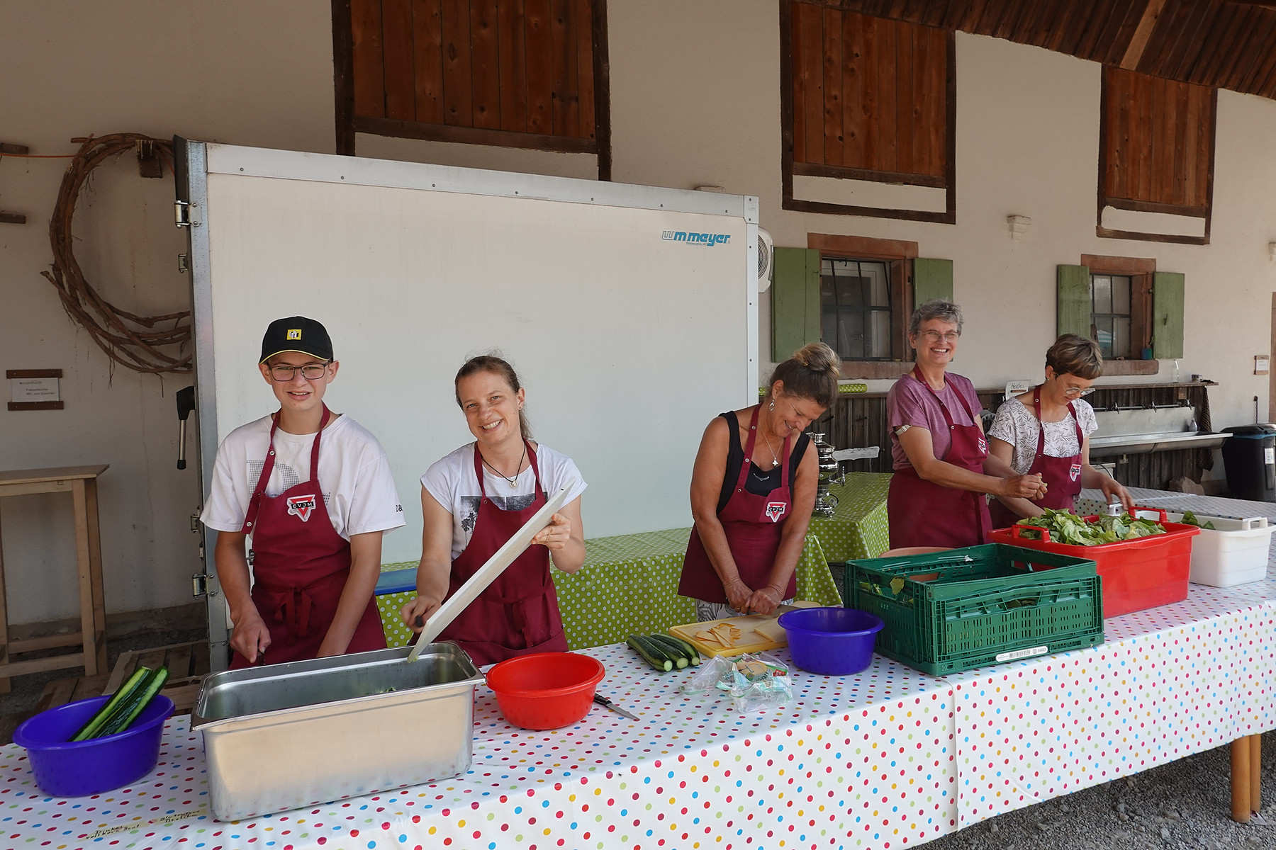 Am Montag hieß es bei herrlichem Sommerwetter für die Teilnehmerfamilien: Herzlich willkommen auf der Zeltwiese des Marienhofs! Wohnwagen, Wohnmobile und Zelte wurden in Position gebracht und aufgebaut. Die Kinder – vor allem die, die schon öfter da waren – tobten auf der Wiese und fühlten sich gleich wie zu Hause.